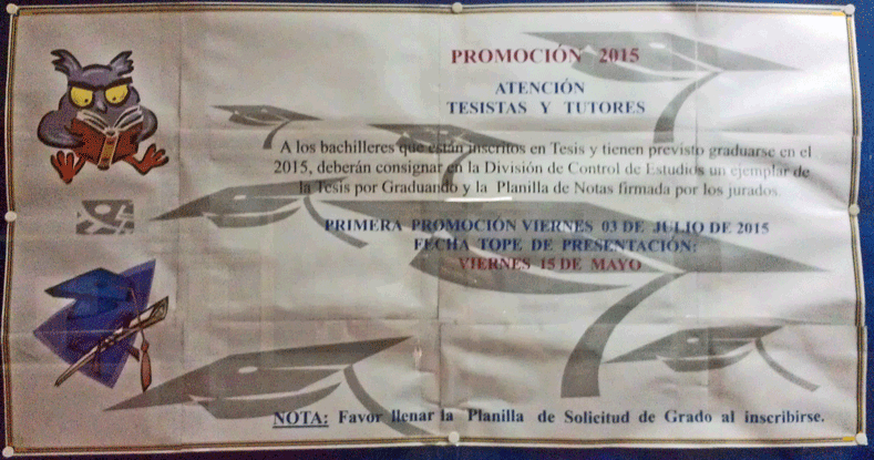 Los bachilleres que están inscritos en Trabajo Especial de Grado, y tienen previsto graduarse en el 2015, deberán consignar en la División de Control de Estudios un ejemplar de la Tesis por Graduando y la Planilla de Notas firmada por los Jurados.